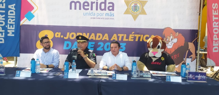 En rueda de prensa realizada en el Remate de Paseo de Montejo en la que se contó con la presencia del secretario técnico de Deportes Municipal, Jesús Aguilar y Aguilar, y el regidor Rafael Rodríguez Méndez, el director de la Policía Municipal de Mérida, comisario Mario Arturo Romero Escalante informó que después de que en los años 2020, 2021 y 2022 no se llevará a cabo con motivo de la pandemia del COD-19 en esta ocasión se reactiva nuevamente esta jornada atlética D.A.R.E. cuya realización ya era una tradición entre los niños, niñas y adolescentes del municipio.