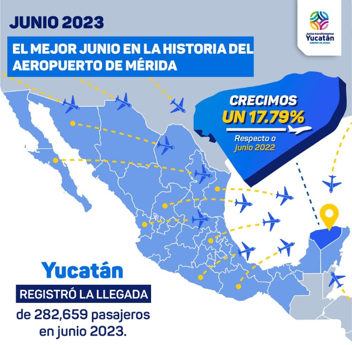 Mérida, Yucatán, 6 de julio de 2023.- Este 2023, Yucatán registró el mejor junio en su historia en cuanto a movimiento de pasajeros por vía aérea, pues el Aeropuerto Internacional de Mérida “Manuel Crescencio Rejón” recibió 282,659 viajeros, lo que significó un crecimiento de casi 18% respecto del mismo periodo, pero de 2022, fruto de la promoción turística que encabeza el Gobernador Mauricio Vila Dosal para posicionar al estado ante los ojos del mundo e impulsar la llegada de más visitantes.