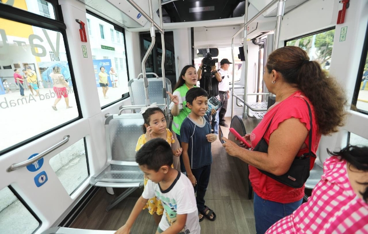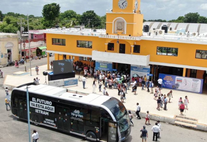 Kanasín, Yucatán, 7 de julio de 2023.- Para que los habitantes de Kanasín y colonias vecinas puedan conocer las bondades y comodidades que ofrece el Ie-Tram, transporte público 100% eléctrico, desde este día y hasta el jueves 13 del presente, la unidad de prueba estará en exhibición frente al Palacio Municipal de esta localidad.