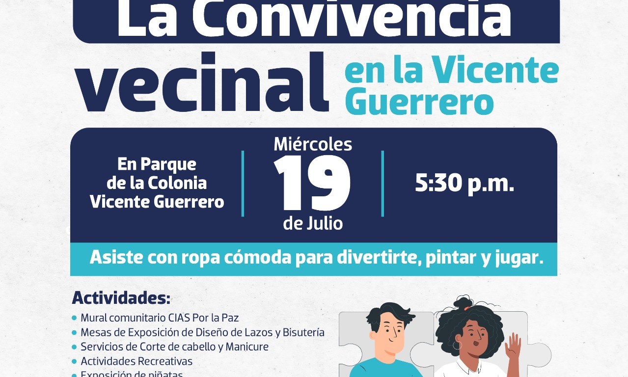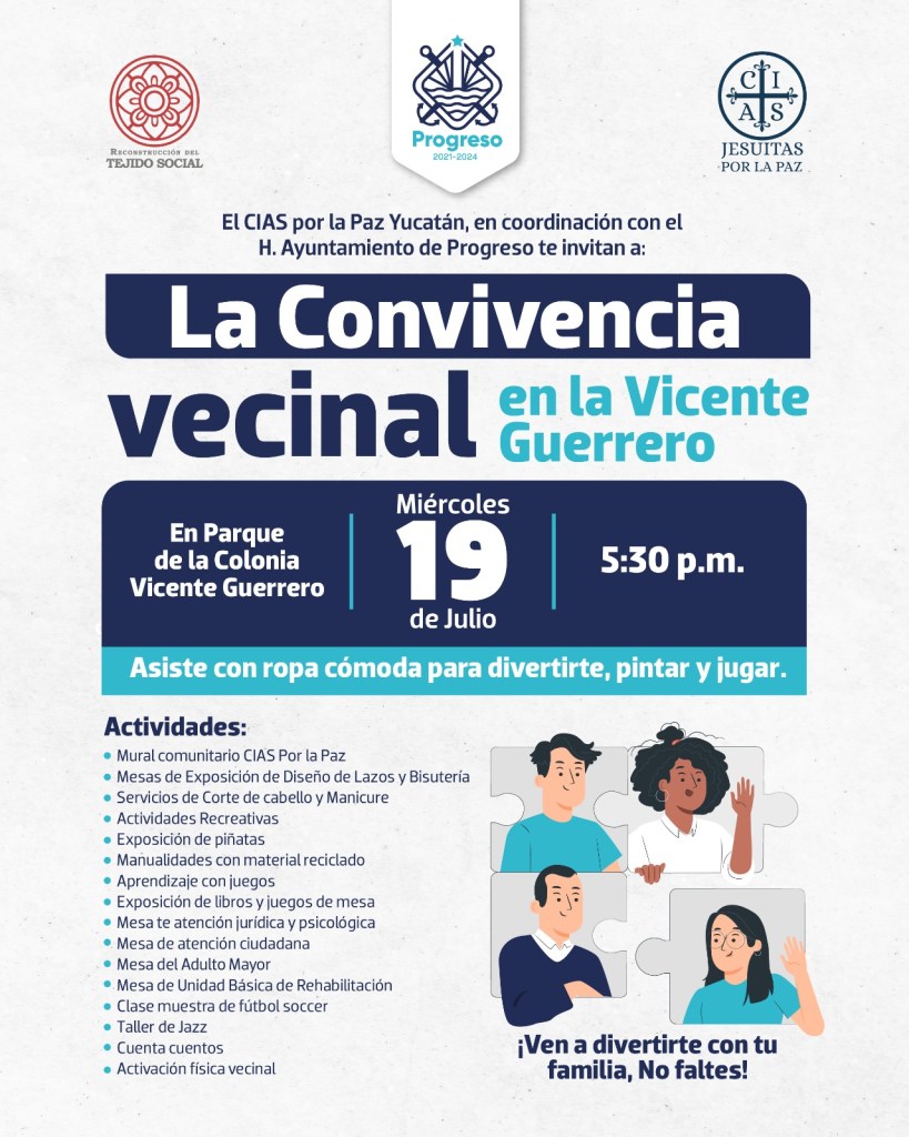 CIAS por la paz y H. Ayuntamiento de Progreso que encabeza el alcalde Julián Zacarías Curi te invitan a la convivencia familiar que tendrá cita este miércoles 19 de julio a las 5:30pm, en el parque de la colonia Vicente Guerrero.
