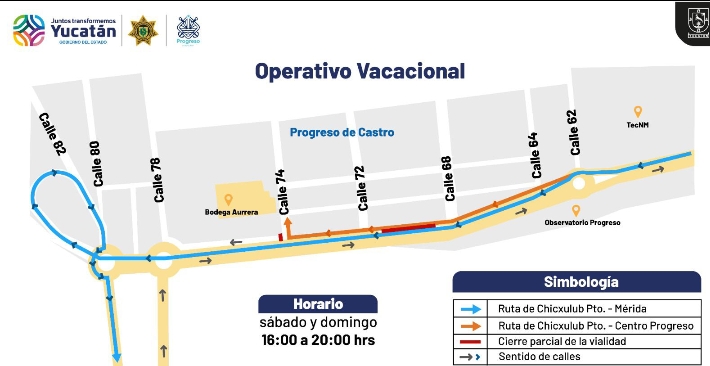 Por su parte, quienes transiten de Chicxulub al Centro de Progreso, cuando lleguen a la glorieta de la calle 62 tomarán la lateral hasta la calle 74 en donde darán vuelta a la derecha.