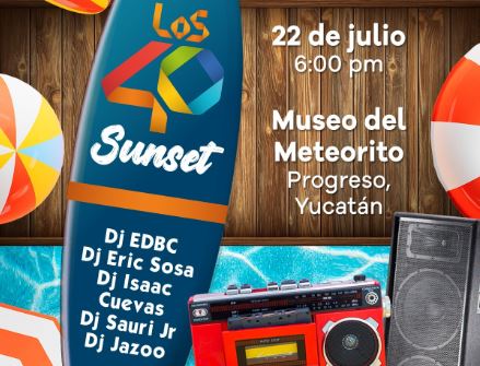 Mérida, Yucatán, a 21 de julio de 2023. Como parte de las actividades para conmemorar el Primer Aniversario del Museo del Meteorito, que a cargo de Cultur, se llevará al cabo este sábado 22 de los corrientes, a partir de las 6 de la tarde, el evento denominado «Los 40 Sunset, edición especial de verano».