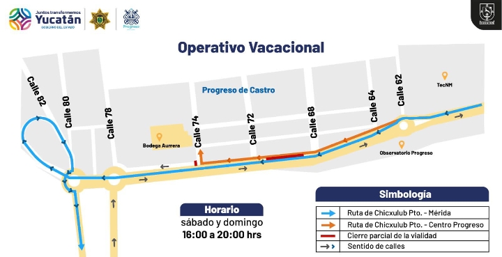 Por su parte, quienes transiten de Chicxulub al Centro de Progreso, cuando lleguen a la glorieta de la calle 62 tomarán la lateral hasta la calle 74 en donde darán vuelta a la derecha.