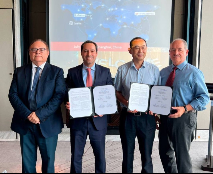 Shanghai, China, 22 de julio de 2023.- La misión comercial que realiza el Gobernador Mauricio Vila Dosal por el gigante asiático para atraer más inversiones al estado que se traduzcan en mayores fuentes de empleos mejor pagados para los yucatecos, rinde frutos, al dar como resultado la firma de una carta intención con las empresas Xinyatong Metal Manufacture y Buchanan Group para el establecimiento de una planta de manufactura en Ticul que podría generar hasta 200 nuevas plazas laborales en Yucatán.