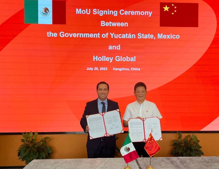 Hangzhou, China, 21 de julio de 2023.- Las gestiones y promoción internacional de Yucatán que realiza el Gobernador Mauricio Vila Dosal se ven concretadas en la misión comercial que realiza por China, luego de firmar con la empresa Holley Global una carta de intención para que la compañía asiática llegue a Yucatán y establezca un parque industrial de 1,000 hectáreas en el municipio de Umán, proyecto que atraerá a otras firmas del giro que quieran invertir en la entidad, lo que se traduciría en la generación de un importante número de empleos mejor pagados para las familias yucatecas.