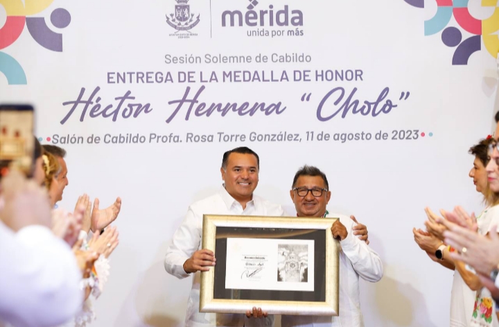 Mérida, Yucatán a 11 de agosto de 2023.- El Alcalde Renán Barrera Concha entregó la medalla de honor Héctor Herrera “Cholo” 2023 al maestro Elmer Octavio de Guadalupe Ayil Ortega “Octavio Ayil” en reconocimiento a su destacada labor y trayectoria artística de más de 50 años como actor, cantante, bailarín y coreógrafo del teatro regional yucateco.