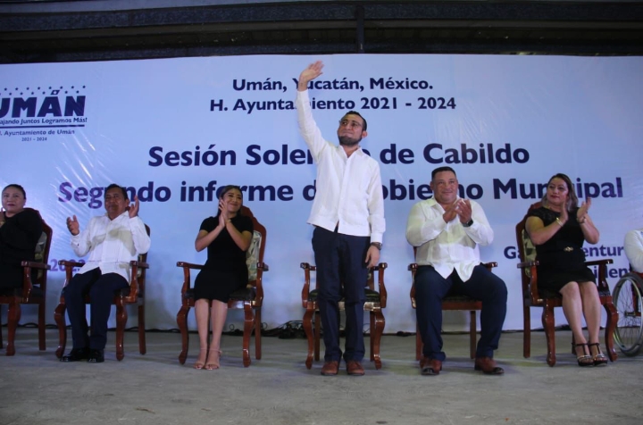 Umán, Yucatán a 19 de agosto de 2023.- Ante la presencia de miles de umanenses rindió su segundo informe de resultados el Presidente Municipal de Umán, Dr. Gaspar Ventura Cisneros Polanco quien ha sentado las bases para que la Ciudad Capital de las Industrias continúe en constante desarrollo con servicios públicos municipales eficientes y de calidad.