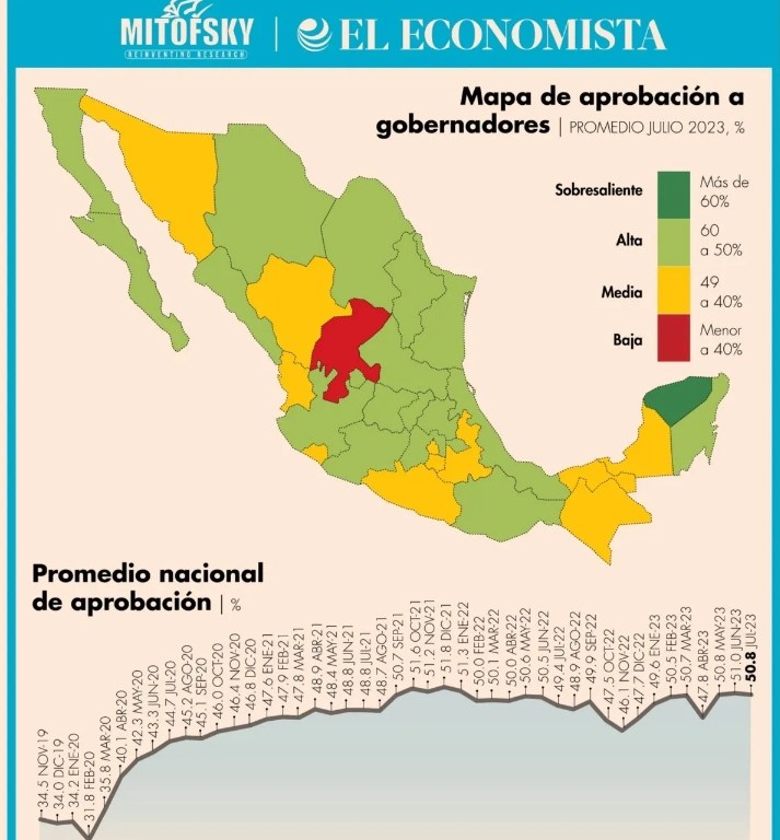 En contraposición, en el fondo del ranking se ubicaron Indira Vizcaíno (Colima); Cuauhtémoc Blanco (Morelos) y David Monreal (Zacatecas) con 41.9%; 40.4% y 38.7 por ciento todos de Morena y aliados.