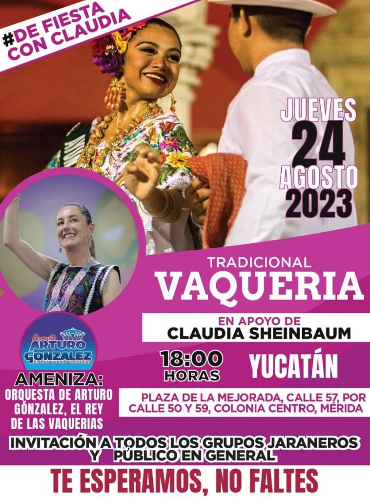 La magna vaquería se realizará a partir de las 6 de la tarde, amenizada por la orquesta de Arturo González, el Rey de las Vaquerías. Se espera la participación de contingentes y delegaciones de jaraneros de varios municipios, así como de simpatizantes de la Dra. Claudia en Yucatán.
