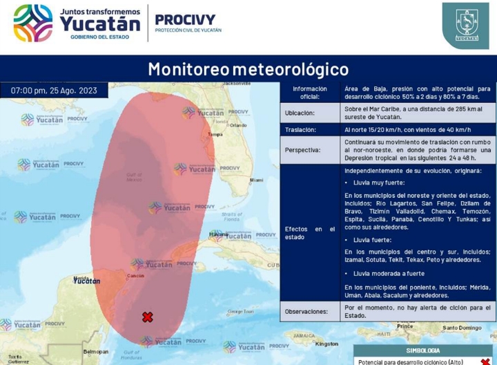 La dependencia menciona que prosigue el monitoreo permanente de dicho sistema con alto potencial de desarrollo ciclónico, aunque por el momento no hay ninguna alerta para Yucatán, por lo que emite este reporte con fines informativos como parte de las medidas de prevención y seguridad instruidas por el gobernador Mauricio Vila Dosal.