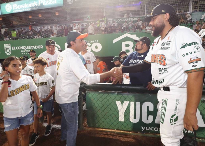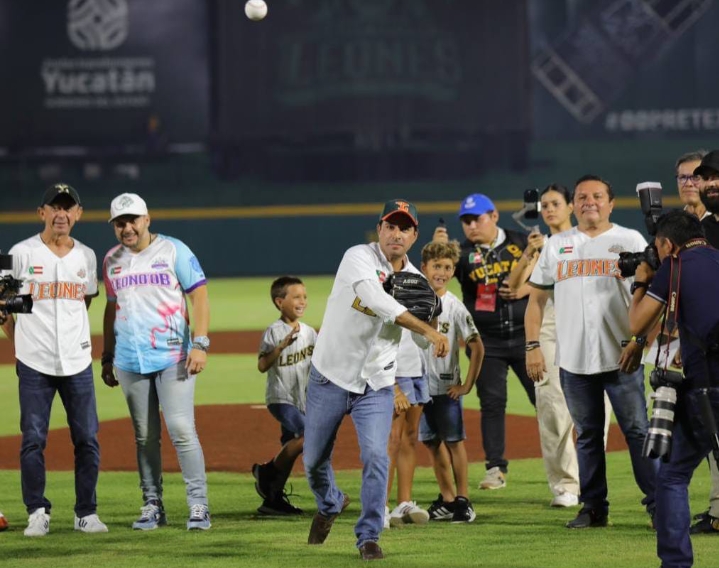 Acompañado de Juan José y Erick Arellano Hernández, presidentes del Consejo Administrativo y Ejecutivo, respectivamente, de los Leones de Yucatán, el Gobernador envió la pelota al jom teniendo como bateador al alcalde de Mérida, Renán Barrera Concha, y como receptor Iván García.