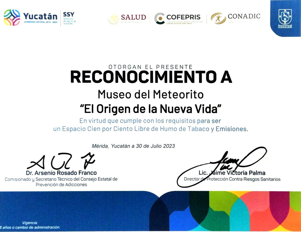 Mérida, Yucatán, a 30 de agosto de 2023. El Museo del Meteorito, que administra Cultur, recibió hoy de la Dirección Protección contra Riesgos Sanitarios, de los Servicios de Salud de Yucatán (SSY), el reconocimiento como “Espacio 100% Libre de Humo de Tabaco y Emisiones”.