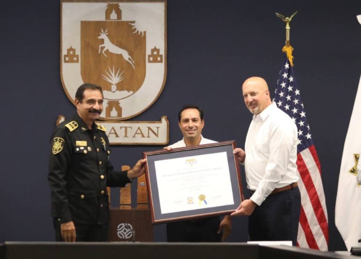 Acompañado del titular de la SSP, Luis Felipe Saidén Ojeda, el Gobernador recibió del director Ejecutivo de CALEA, W. Craig Hartley Jr., este galardón que es otorgado al reunir la acreditación en sus tres programas, que son el de aplicación de la ley, el de Centros de Comunicaciones y el de Academias de entrenamiento; además que es reflejo del importante impulso que su administración ha dado a la preservación y fortalecimiento de la paz y tranquilidad de las familias yucatecas.