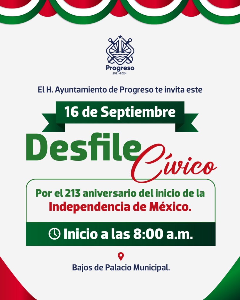 Progreso, Yucatán a 1 de septiembre de 2023. El H. Ayuntamiento que preside el alcalde Julián Zacarías Curi, invita a la ciudadanía a asistir a los eventos que el Comité Organizador tiene programado con motivo de los festejos del mes patrio.