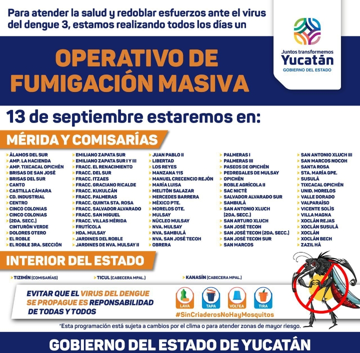 El carro fumigador también acudirá: Nva. San José Tecoh, San José Tecoh 2da Sección, San José Tecoh Sur, Obrera, Palmeras I, Palmeras III, Paseos de Opichén, Pedregales de Mulsay, Opichén, Roble Agrícola II, San Nicté, Salvador Alvarado Sur, Sambulá, San Antonio Xluch 2da Sección, San Antonio Xluch III, San Arturo Xluch, Xoclán, Xoclán Susulá, Xoclán Bech, Zazil Há, San Marcos y San Marcos Nocoh.