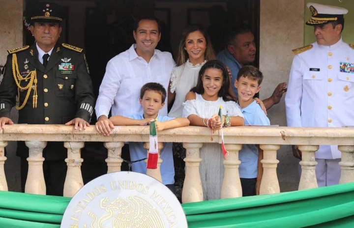 Acompañado de su esposa, María Eugenia Ortiz Abraham, y sus 3 hijos Alejandrina, Mauricio y Santiago, el Gobernador presenció desde el balcón central de Palacio de Gobierno el desfile en el que participaron 69 contingentes conformados por 5,336 elementos para conmemorar los festejos patrios por el aniversario 213 del inicio de la independencia de México.