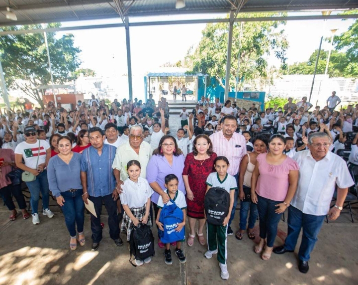 Por su parte, Marissa Salazar Azcorra resaltó que esta entrega no solo representa un ahorro significativo de 2,950 pesos por niña y niño para cada familia, sino que los beneficios abarcan otros sectores, como la textil y artesanal, pues a través de los pequeños productores del interior del estado se elaboran y producen los zapatos, las mochilas y los uniformes, así como las chamarras que se entregarán en los próximos meses.