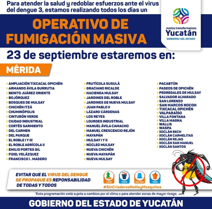 El carro fumigador también acudirá a: Pacabtún, Paseos de Opichén, Pedregales de Mulsay, Salvador Alvarado, San Lorenzo, San Marcos Nocoh, Tixcacal Opichén, Valparaíso, Villa Fontana, Villa Magna, Wallis Waspa, Xoclán Bech, Xoclán Carmelitas, Xoclán Rejas, Xoclán San Manuel y Xoclán Santos.