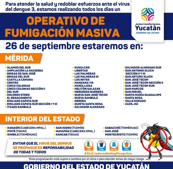 🔆Hoy martes 26 de septiembre habrá fumigación 🛻💨 en las colonias.