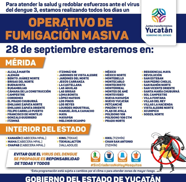 🔆Hoy jueves 28 de septiembre habrá fumigación 🛻💨 en las colonias.