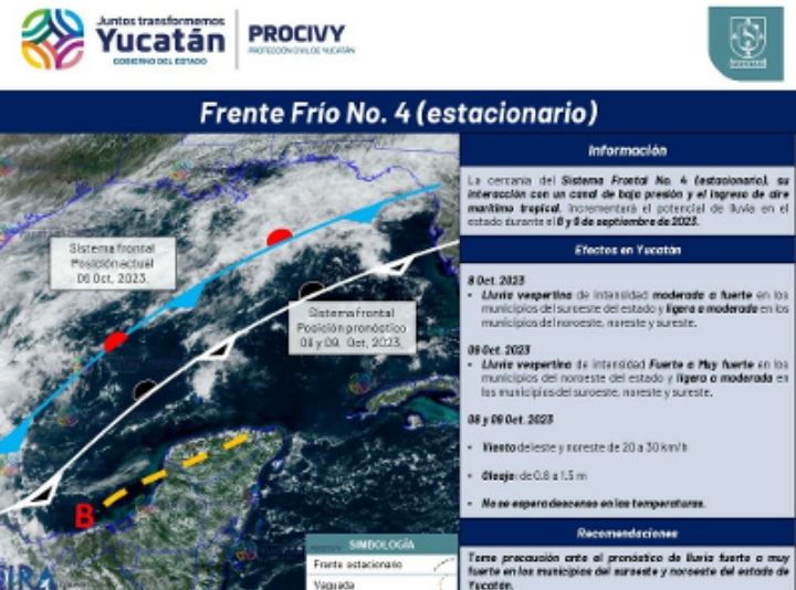Con base en el análisis del muestreo satelital sobre el Frente Frío No. 4 ubicado en el Golfo de México, el Sistema Estatal de Monitoreo y Alertamiento (SEMA) de Procivy informa que para el domingo 8 de octubre se espera lluvia vespertina de intensidad moderada a fuerte en municipios del suroeste del estado y de ligera a moderada en demarcaciones del noroeste, noreste y sureste.