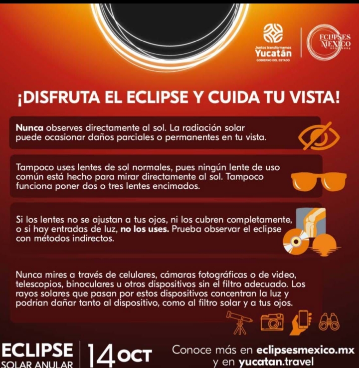 Mérida, Yucatán, 9 de octubre de 2023.- La Secretaría de Salud del estado y el Comité Yucatán de Eclipses 2023-2024 hicieron un llamado a la población a seguir las recomendaciones y medidas adecuadas para atestiguar de forma segura y preservar la salud visual durante el eclipse solar anular que se podrá observar en la entidad el próximo sábado 14 de octubre en la entidad.