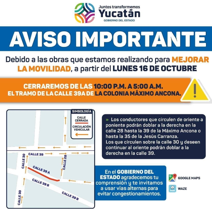 Les informamos que por trabajos de mejora a la movilidad el tramo de calle 39 A de la Colonia «Máximo Ancona» permanecerá cerrado a partir del lunes 16 de octubre de 10:00 p.m a 5:00 a.m, por lo que los invitamos a tomar rutas alternas. La movilidad quedará de la siguiente manera👇. En equipo seguimos transformando #Yucatán.