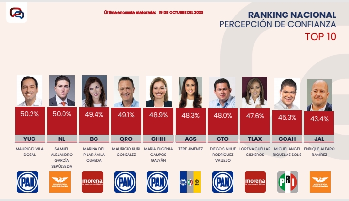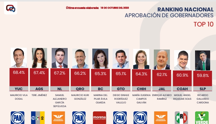 Según los resultados del mes de octubre, Vila Dosal, gobernador de Yucatán, tiene el 68.4% de aprobación ciudadana, seguido de Tere Jiménez de Aguascalientes, con 67.4%; y de Samuel García, de Nuevo León, con 67.2%.