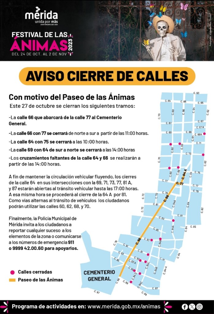 Asimismo, la SSP y la Policía Municipal desplegarán un operativo vial este 27 de octubre, que abarcará del Cementerio General sobre la calle 66 hasta la calle 77, en la zona de La Ermita de Santa Isabel, por tanto, se invita a las y los conductores a tomar sus precauciones o tomar rutas alternas ya que se efectuarán los siguientes cierres: