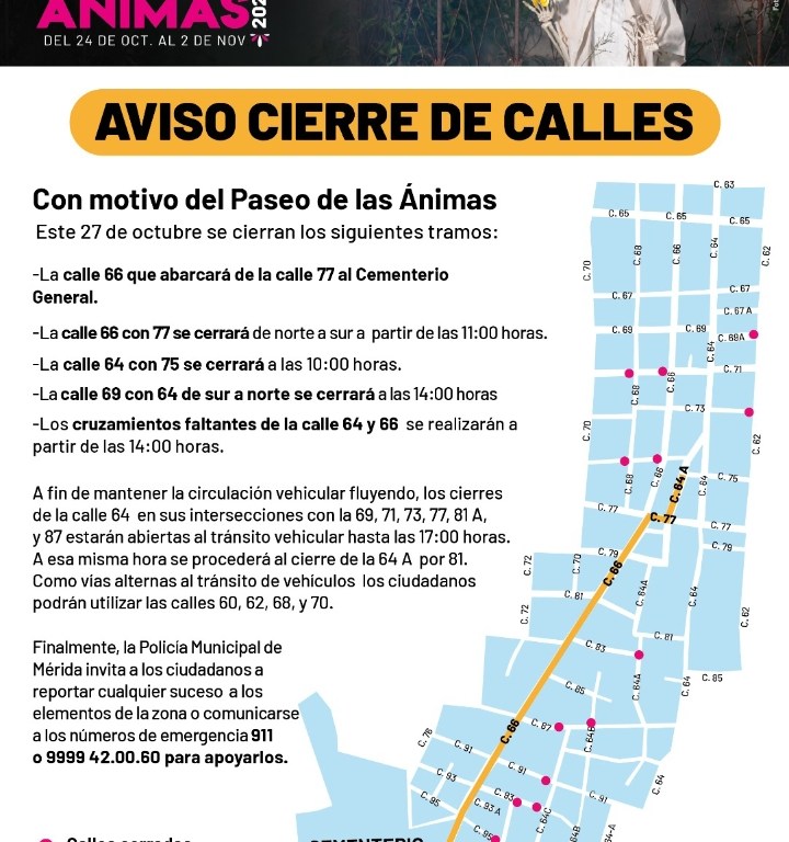 Asimismo, la SSP y la Policía Municipal desplegarán un operativo vial este 27 de octubre, que abarcará del Cementerio General sobre la calle 66 hasta la calle 77, en la zona de La Ermita de Santa Isabel, por tanto, se invita a las y los conductores a tomar sus precauciones o tomar rutas alternas ya que se efectuarán los siguientes cierres: