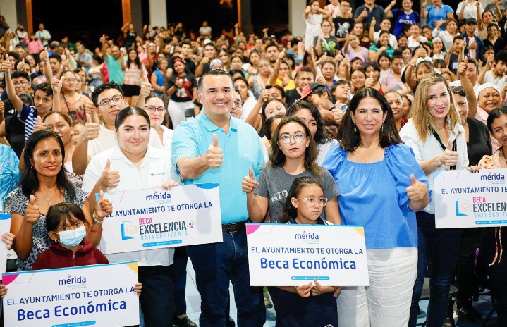 Mérida, Yucatán a 26 de octubre de 2023.- El trabajo que realizamos desde el Ayuntamiento de Mérida está pensado para ofrecerles un mejor futuro a las y los jóvenes mediante la transformación social, como hoy que refrendamos nuestro compromiso con la educación al entregar cerca de 6 mil apoyos entre “Becas de Excelencia Universitaria” y “Becas Económicas” a estudiantes de primaria y secundaria, manifestó el Alcalde Renán Barrera Concha.