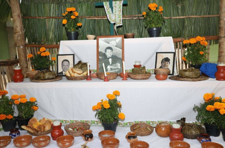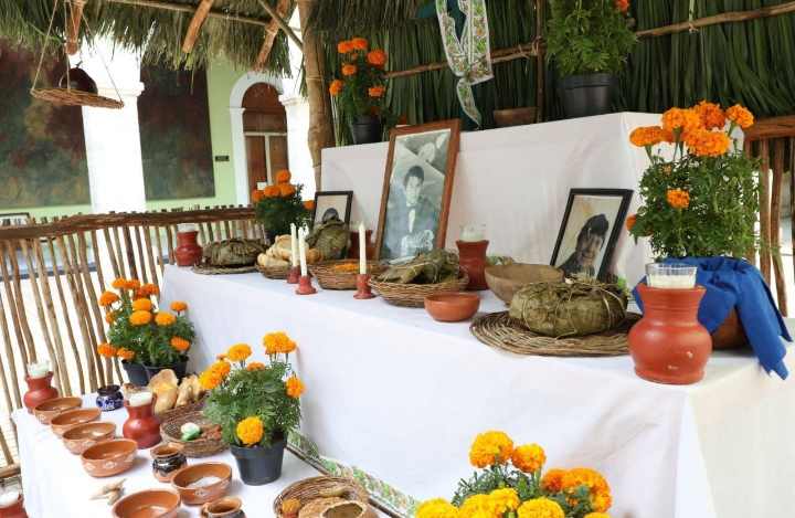 En este sentido, la muestra, cuya elaboración corrió a cargo de la Secretaría de la Cultura y las Artes (Sedeculta), está conformada por tres niveles que son adornados con elementos tradicionales de los altares como la comida yucateca, frutas, dulces de yuca, ciricote y bebidas como atole y chocolate.