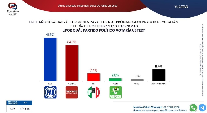 La encuesta de la intención del voto con la pregunta: si hoy fueran las elecciones para gobernador de Yucatán fue elaborada el 30 de octubre y arroja los siguientes resultados: