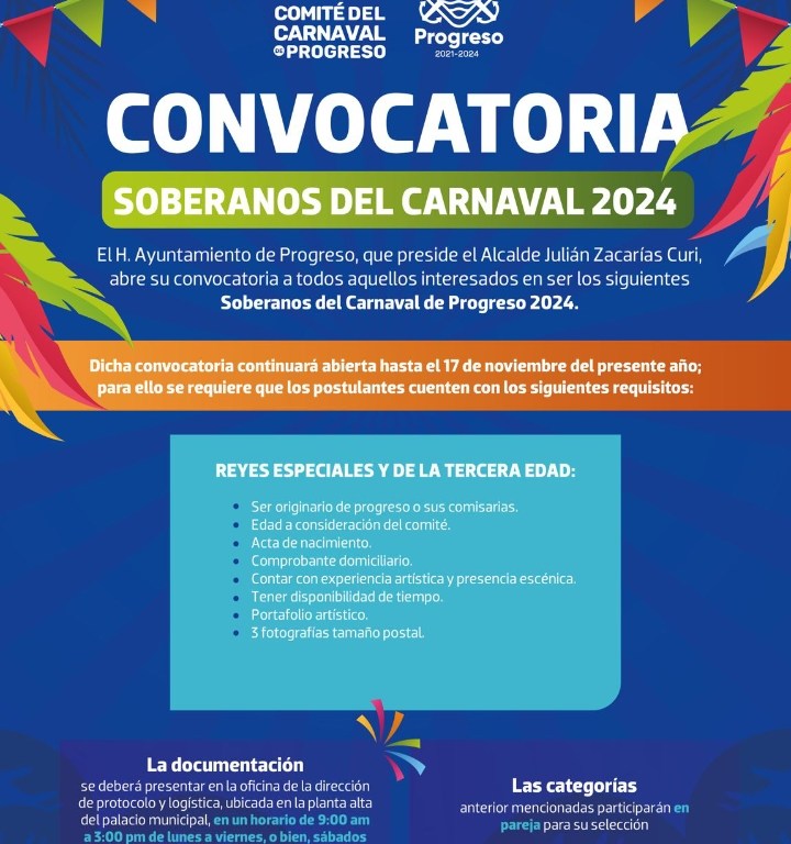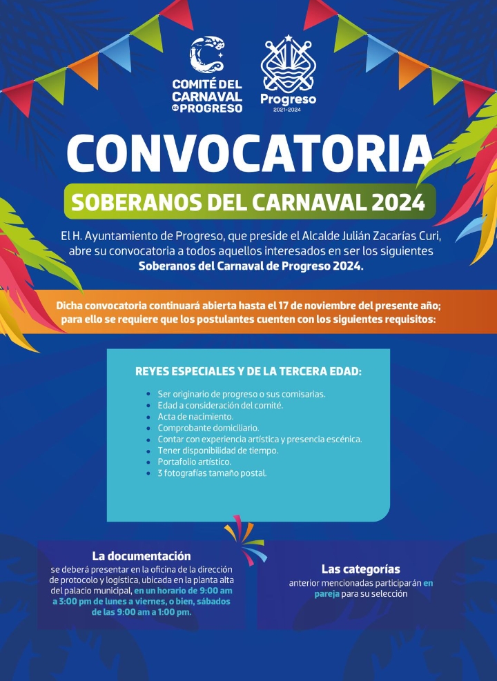 El H. Ayuntamiento de Progreso, presidido por el Alcalde Julián Zacarías Curi, abre su convocatoria a todos aquellos interesados en ser los próximos soberanos del «Carnaval de Progreso 2024.»