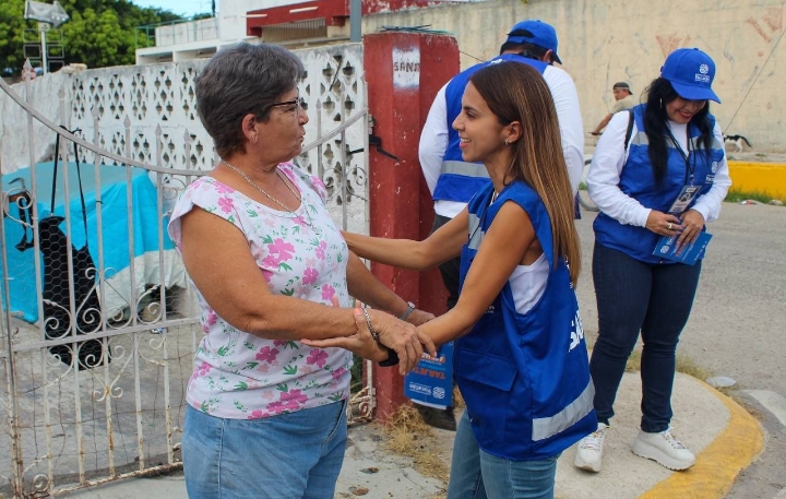 Rodríguez Heredia realizó las visitas de manera coordinada con las mujeres y hombres identificados por sus chalecos azules, quienes cada día parten de puntos de encuentro para cubrir diferentes zonas, difundiendo los programas del Gobierno estatal.