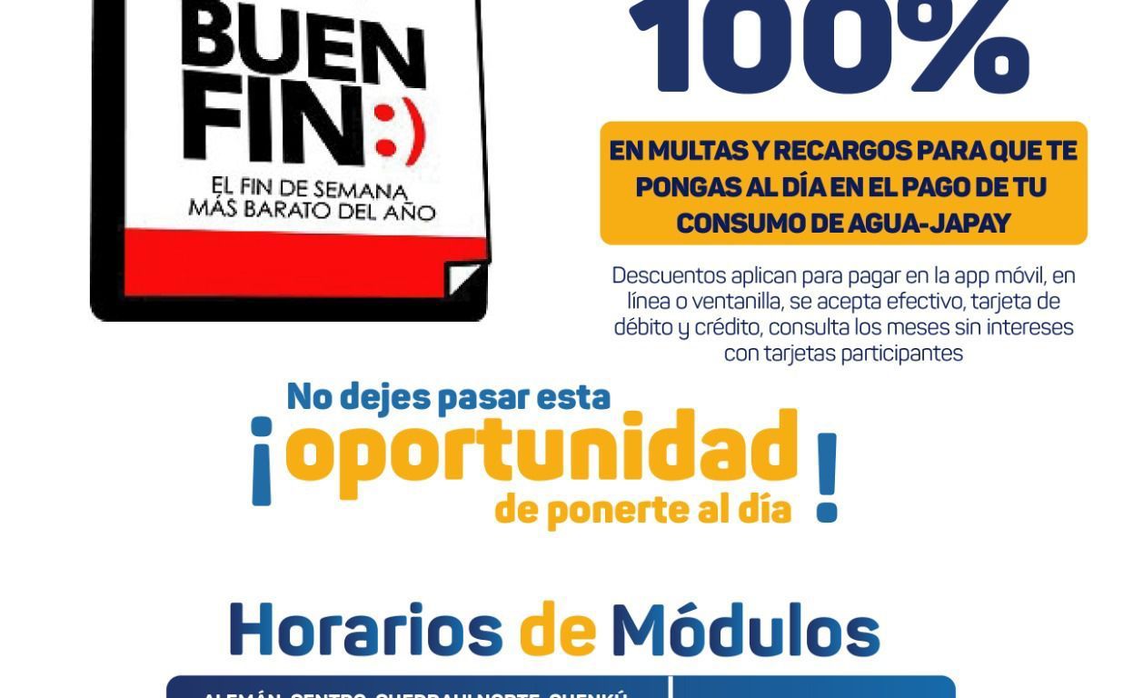 Mérida, Yucatán a 17 de noviembre del 2023. Siguiendo las instrucciones del gobernador Mauricio Vila Dosal, y en apoyo de la economía de las y los yucatecos, la Junta de Agua Potable y Alcantarillado de Yucatán (Japay) se une al Buen Fin, mediante el descuento del 100% en multas y recargos.