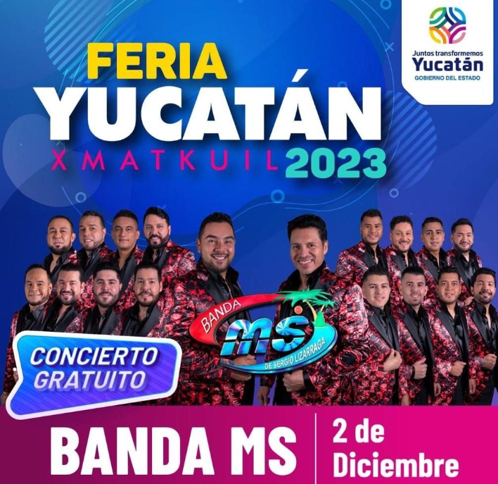 Como se informó, la Banda MS se presentará de manera gratuita, por primera vez en Yucatán, el próximo sábado 2 de diciembre en el marco de la Feria Xmatkuil. La banda de estilo sinaloense deleitará al público asistente al Centro de Espectáculos Montejo, ubicado al interior del recinto ferial, con lo mejor de su repertorio, entre las que se encuentran melodías como: “El Color de Tus Ojos”, “Me Vas a Extrañar” y “No me pidas perdón”, entre otras.