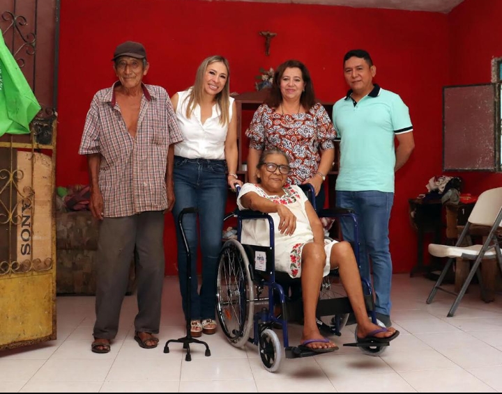 Acompañada por la directora del DIF Municipal, Silvia Sarti González, la Presidenta del DIF Mérida realizó la entrega de diversos aparatos ortopédicos como sillas de ruedas, auxiliares auditivos, bastón de cuatro apoyos, andadores rollator y silla de ruedas juvenil.