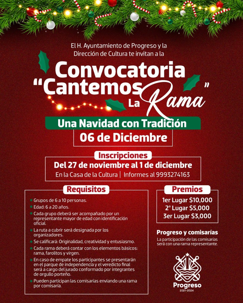 Progreso, Yucatán a 30 de noviembre de 2023. A través de la convocatoria “Cantemos la Rama”, la Dirección de Cultura del Ayuntamiento de Progreso busca rescatar una de las tradiciones más especiales de esta temporada navideña: “La Rama”; cantico que realizan niños y niñas a las afueras de los hogares.