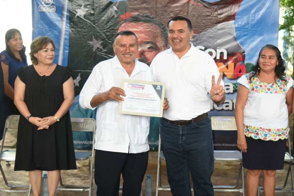 Finalmente, acompañado de Reina Cob Balam, presidenta del Comité Directivo Municipal de Yaxcabá, Barrera Concha entregó el certificado como coordinador del equipo Yucatán en el municipio a Genrry Pacab y lo felicitó por esta encomienda.