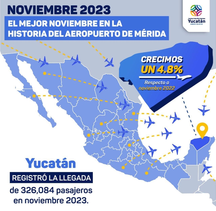 - De enero a noviembre, el Aeropuerto Internacional de Mérida tuvo un movimiento total de 3,355,851 personas, lo que representó el mayor tráfico de pasajeros durante ese periodo desde que se tiene registro.