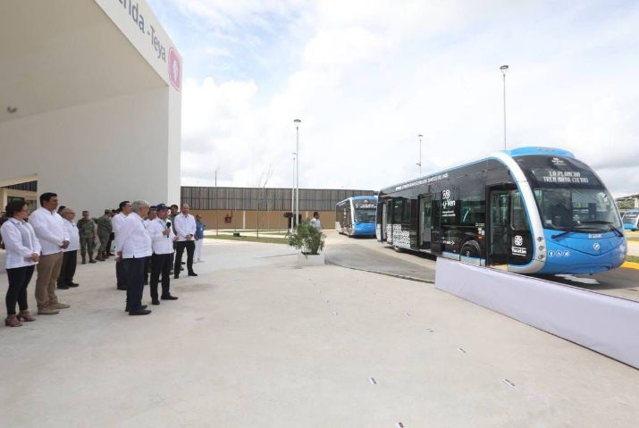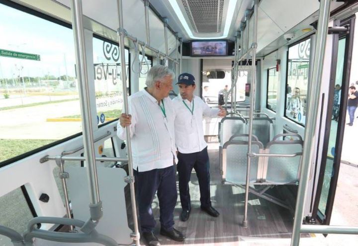 -Vila Dosal y López Obrador se subieron a una de las 11 unidades del Ie-tram que ya se encuentran en Yucatán, donde constataron la alta tecnología que se utiliza en este transporte que es el primero 100% eléctrico en el Sureste y único en su tipo en Latinoamérica.