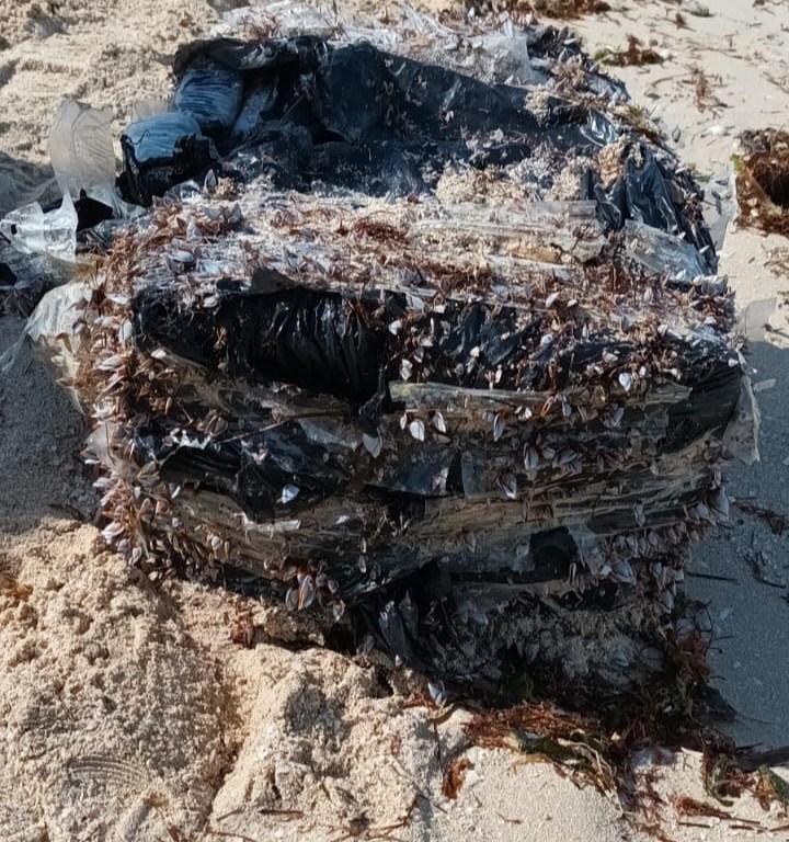 Una bolsa negra que contenía 25 paquetes de cocaína recaló hoy en la playa de Chicxulub Puerto.