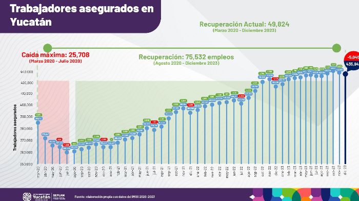El reporte del IMSS, respecto al último mes del 2023, indicó que dicho crecimiento de 5.2% de la entidad es superior al nacional que es de 3% y con lo que se posicionó al estado entre los primeros tres de todo el país con mayor crecimiento, lo que es una nueva máxima posición histórica para Yucatán.