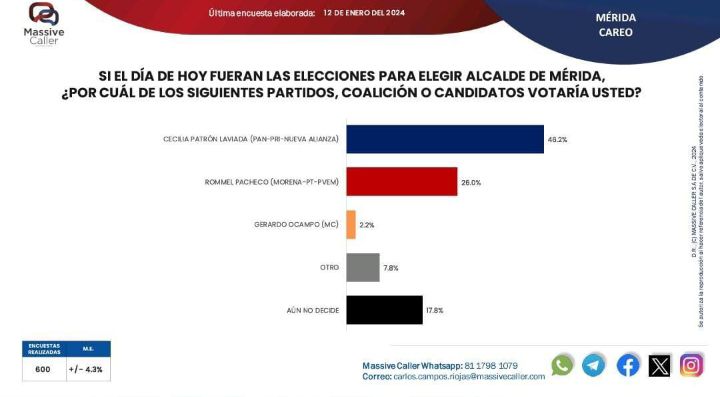 En el reciente estudio de Massive Caller, Cecilia Patrón Laviada lidera nuevamente las encuestas por más de 20 puntos de diferencia en la intención de voto para dirigir la alcaldía de Mérida.