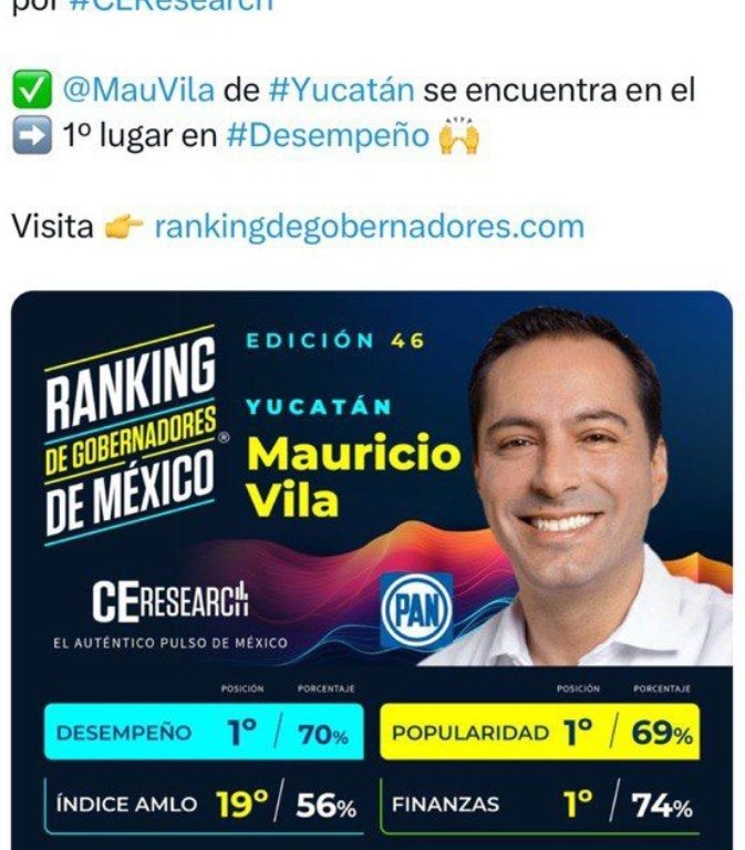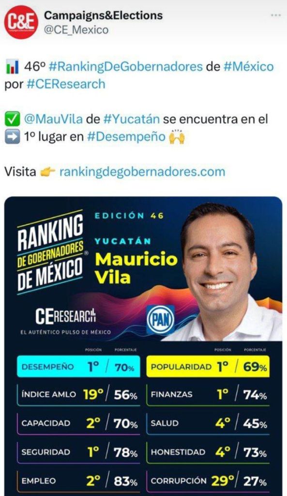 De acuerdo con los resultados de la empresa de análisis «CEResearch» en el más reciente Ranking de Gobernadores de México de 2024, Vila Dosal llega al sexto año de su gobierno con una popularidad del 69% y ocupando el primer lugar por las estrategias y trabajo desarrollados en seguridad y manejo de las finanzas, con el 78% y 74% de aprobación ciudadana, respectivamente.