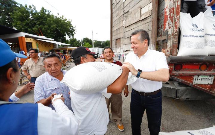 Acompañado de Luis Martín Oroza, secretario de Desarrollo Rural del Gobierno del Estado (SEDER), y Santos Cetz Celis, comisario de Dzununcán, informó que el apoyo consistente en la entrega de 71.48 toneladas de maíz en sacos de 20 kg cada uno, beneficiará a 3,754 familias de 14 comisarías.