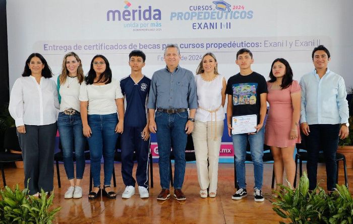 Durante la entrega de certificados de becas para Cursos propedéuticos EXANI-I y EXANI-II, que se realizó en la Cancha de Usos Múltiples del Centro de Desarrollo Integral “El Papa”, el Presidente Municipal, acompañado de su esposa y presidenta del DIF Mérida, Verónica Cetina Arjona, indicó que aunque la educación no es un tema propio del Ayuntamiento, se trabaja con las autoridades estatales para diseñar programas que eviten la deserción escolar mediante la entrega de apoyos económicos para las familias.