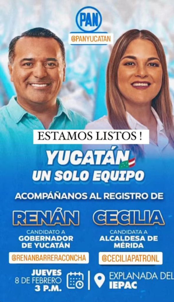 PoliticaRegistro de candidatos del PAN a la gubernatura de Yucatán y la alcaldía de Mérida Comparte esto: Enviar un enlace a un amigo por correo electrónico (Se abre en una ventana nueva) Correo electrónico Más Comparte en Facebook (Se abre en una ventana nueva) Facebook Compartir en X (Se abre en una ventana nueva) X Me gusta Cargando...
