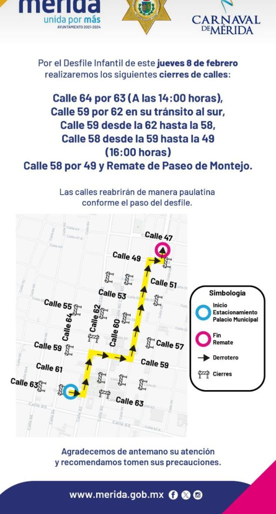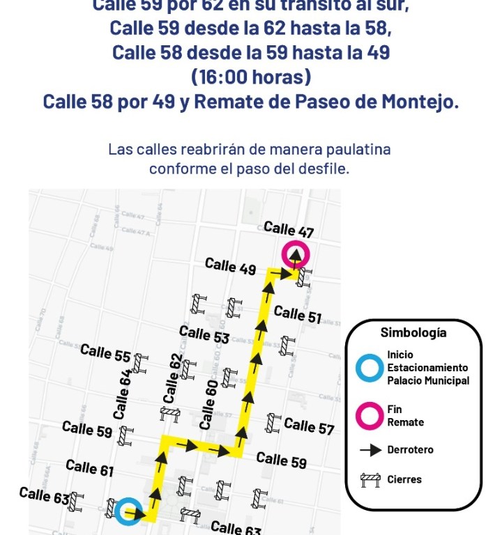 Igualmente, se cerrará la calle la 58 desde 59 hasta 49. Así como la 58 por 49 e inicio de Montejo, lugar en el que concluirá el Desfile Infantil. Las calles serán abiertas de manera paulatina conforme el paso de los contingentes lo permita.